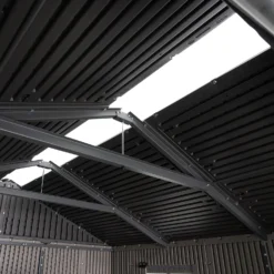 Declutter your garage and find more space to organize your home with Lifetime Sheds. Lifetime’s 7 ft. x 7 ft. Rough Cut™ Sheds are the perfect space for storage bins, gardening tools, and lawn care equipment. The Rough Cut™ Texture has the natural look and feel of wood without the maintenance of painting or staining. The durable HDPE formulation includes UV-resistant pigments and antioxidants that protect the plastic from degrading while ensuring long lasting performance and impact resistance. The steel-reinforced construction, double-wall design ensures a strong structure that is built to withstand the elements. When paired with a sturdy padlock (not included), the steel door latch hasps, deadbolts, and 18-gauge steel reinforcements in the doors provide security and act as a deterrence from theft. The included shed floor (foundation not included) is slip resistant, impact resistant, and protects items stored on the ground. The full-length ridge skylight and wall window provide excellent lighting for the interior of the shed. The wall shelf and 2 corner shelves give you more options for storing your belongings. With a Lifetime 7 ft. x 7ft. Rough Cut™ Shed, you get a stylish and versatile storage option to get organized.