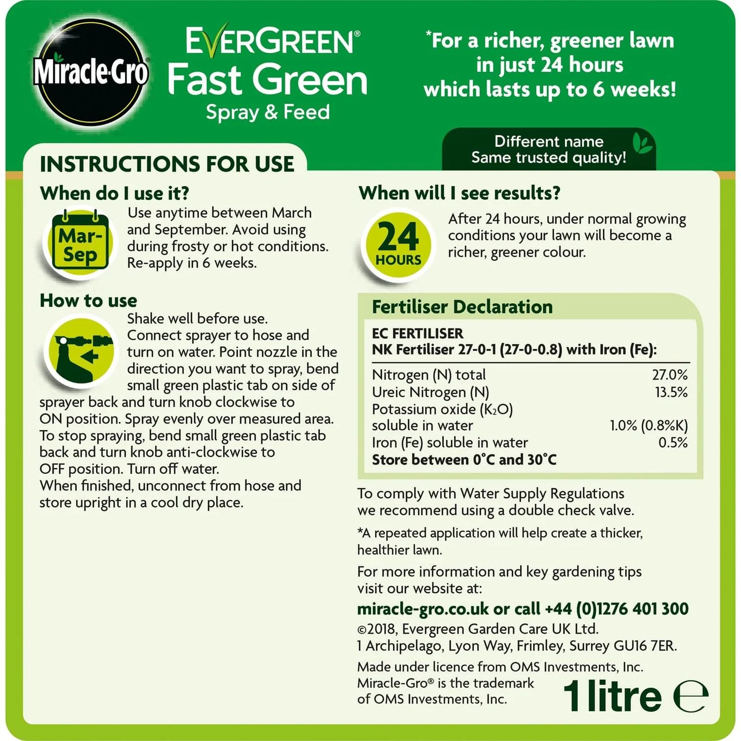 Miracle-Gro Evergreen Fast Green Spray & Feed is a fast acting liquid lawn food that will help you create a thicker, healthier lawn. Your lawn will be noticeably greener after just 24 hours and it will continue to feed for up to 6 weeks